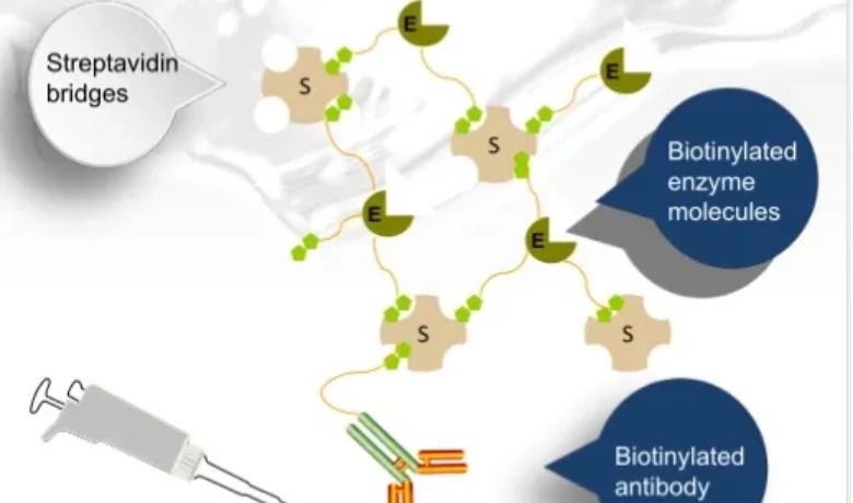 该技术利用抗原与抗体之间的特异性反应来将待测物与酶连接,然后通过酶与底物之间的反应产生颜色变化,从而实现定量测定。测定的对象可以是抗体或抗原。 在这种测定方法中,有三种关键试剂: 固相免疫吸附剂,即固定在载体上的抗原或抗体; 酶标记物,即与抗原或抗体结合并标记上酶的物质; 显色剂,即能够与酶作用并产生颜色反应的底物。 在测量过程中,抗原(或抗体)首先结合在固相载体上,但仍然保留其免疫活性。然后,加入与酶结合的抗体(或抗原)形成偶联物(即标记物),该偶联物仍然保留其免疫活性和酶活性。当偶联物与固相载体上的抗原(或抗体)发生反应结合后,再加入相应的酶底物,就会触发催化水解或氧化还原反应并出现颜色变化。产生的颜色的深浅与所测抗原(或抗体)的含量成正比。这种有色产物可以用肉眼、光学显微镜或电子显微镜观察,也可以使用酶标仪(即分光光度计)进行测定。该方法简单方便、迅速,并且具有高度特异性。